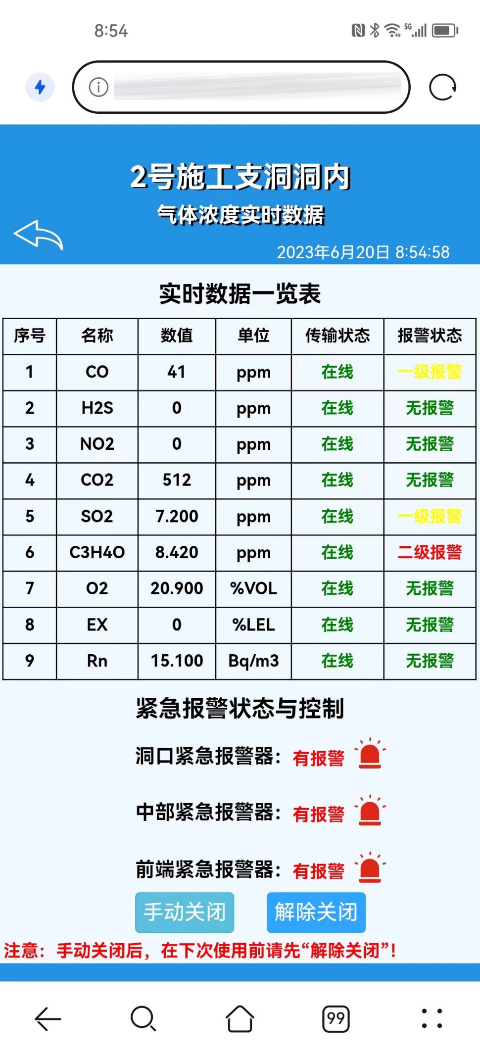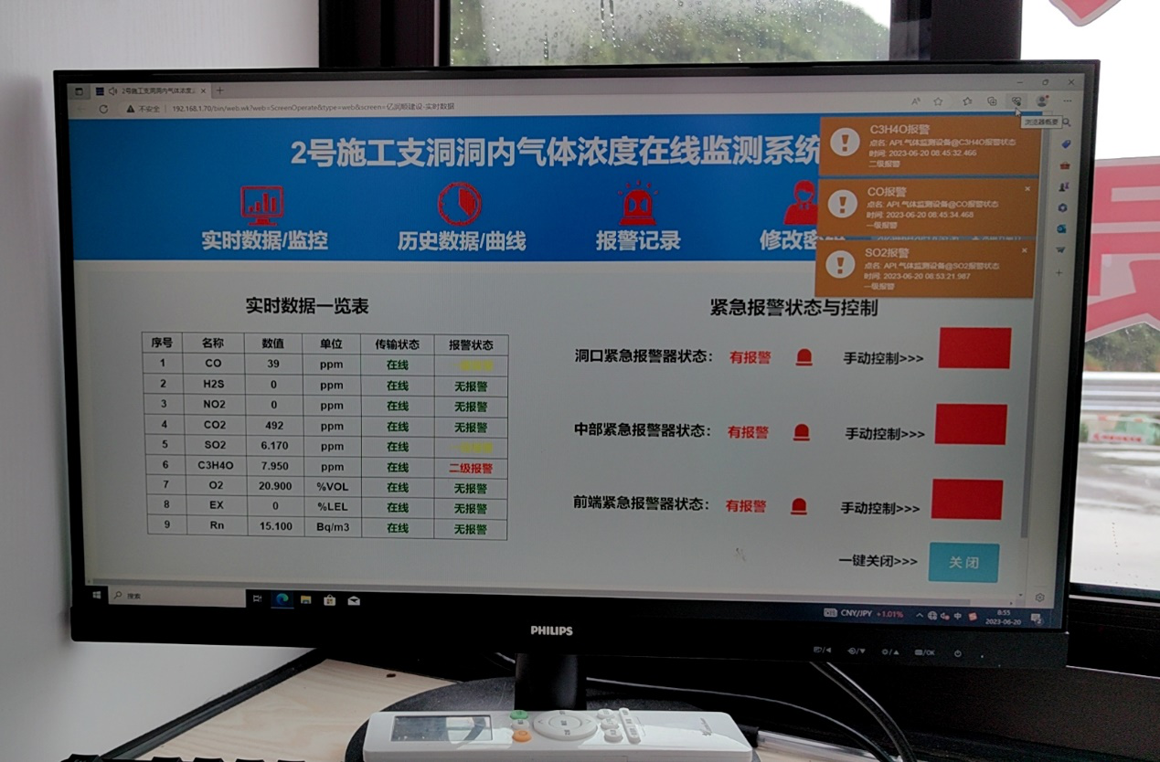 隧道项目在进行掘进或者爆破作业时,会产生有毒有害气体,以及大量粉尘,为保护作业人员安全,需对现场气体进行监测,并在超标时产生报警信号。同时,作业人员也可在发生紧急情况时,手动报警,前端报警时洞口、控制室、管理人员均可收到提醒,提高响应速度。